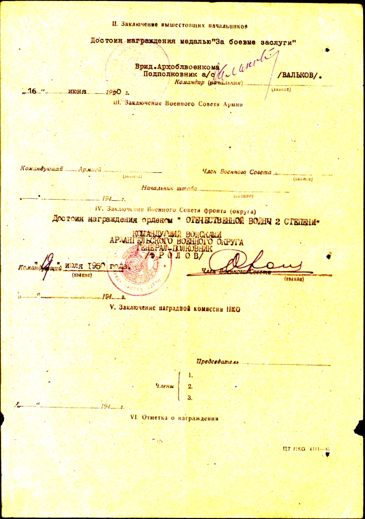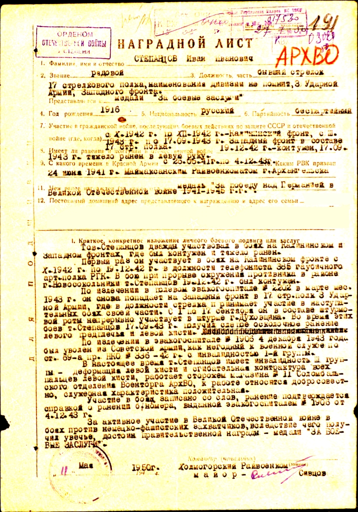 Степанцов Иван Иванович , 1916 г.р., уроженец д. Заречье Житьевского с/с Сямженского р-на Вологодской обл. Призван Маймаксанским РВК г. Архангельска 24.06.1941 года . В Отечественной войне участвовал с 10.1942 года по 12.1942 года - Калининский фронт , с 03.1943 года по 17.09.1943 года - Западный фронт , где был контужен и тяжело ранен . Первый раз он участвует в боях на Калининском фронте телефонистом 385 гаубичного артполка РГК . При прорыве окружения противника в районе г. Новосокольники тов. Степанцов 19.12.1942 года был контужен . По излечении в полевом ЭГ 2202 в марте 1943 года попадает на Западный фронт стрелком в 17 стр. полк 32 стр. дивизии в составе 3-й Ударной Армии . С 1 по 17 сентября он в составе штурмовой роты непрерывно участвует в штурме г. Духовщина . Во время этих боев тов. Степанцов 17.09.1943 года получил тяжелое слепое осколочное ранение левого предплечья и левой кисти . По излечении в госпитале ЭГ 1906 04.12.1943 года решением ВВК был признан негодным к военной службе . Инвалид 1 гр. По возвращению по месту жительства в г. Архангельск тов. Степанцов работал сторожем магазина № 11 Соломбальского отделения Военторга АрхВО . По представлению Холмогорским райвоенкомом Указом Президиума ВС СССР был награжден орденом "Отечественной войны 2 ст" . Также награжден медалью "За победу над Германией..." .