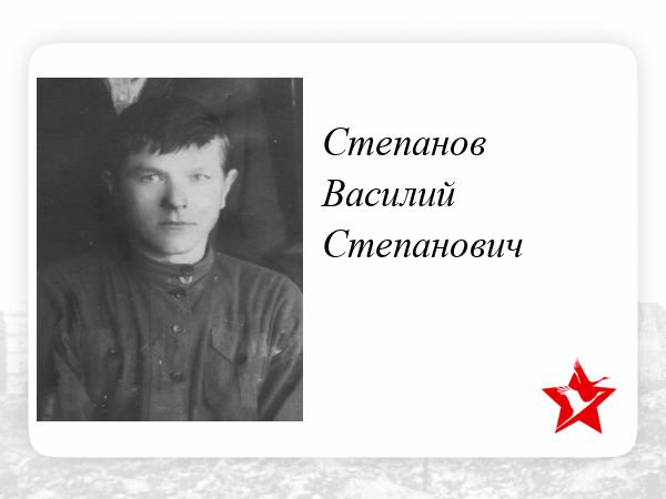 Степанов Василий Степанович родился в январе 1898 в Калининской области, Новоторжском районе, в деревне Печки. Был призван Новоторжским Райвоенкоматом в июле 1941 года. Воевал в 1017-м стрелковом полку. Убит на поле боя в Киришском районе Ленинградской области у деревни Гороховец (Оломна) 11 октября 1941 года. Там же похоронен в братской могиле.
