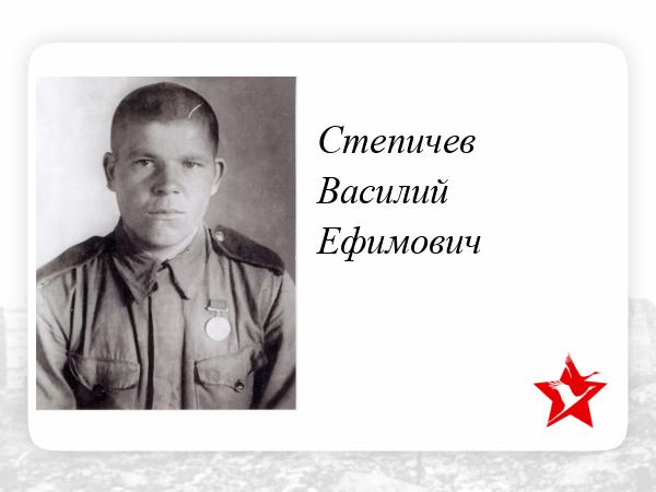 Наш дед, 1910 года рождения, родом из села Иловка Томской области, ушел на фронт в 1941 году, воевал в пехоте на Белорусском фронте и погиб 7 июля 1944 года у д. Синело Минской области при освобождении Минска. Похоронен около деревни Апчак в братской могиле. У него остались жена Анна Яковлевна и двое детей: дочь Надежда Васильевна и сын Степичев Николай Васильевич. Вместе с нашим дедом из семьи Степичевых ушли на фронт еще три брата: Кирилл, Яков и Максим. Из братьев вернулись только Кирилл и Яков, Максим Степичев погиб в августе 1944 года и похоронен в Карелии.