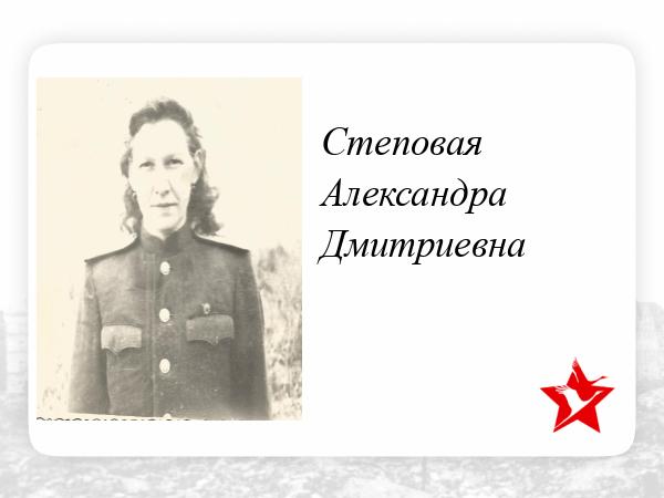 Степовая (Кузнецова) Александра Дмитриевна родилась 22 апреля 1922 года в деревне Верекино Рязанской области. В 1930 году, когда девочке Саше было 8 лет, семья Кузнецовых переехала в Ленинград. Когда началась Великая Отечественная война, Александре Дмитриевне было 19 лет. Она служила рядовым стрелком в 21 части Военно-Воздушной силы Краснознаменного Балтийского Флота с июня 1942 по июль 1944 год, эта база во время Великой Отечественной войны входила в состав действующей Армии. Александра Дмитриевна по ночам охраняла самолеты на военном аэродроме в поселке Лебяжий. Истребители, штурмовики, бомбардировщики мужественно защищали наш замечательный город и корабли Балтийского флота от бомбардировок с воздуха. А также помогли советским войскам серией контрударов сорвать замысел гитлеровского командования взять Ленинград штурмом, помешали блокированию ледовой Дороги жизни через Ладожское озеро, содействовали в прорыве блокады и окончательном разгроме немецких войск под Ленинградом. Александра Дмитириевна рассказывала о том, что когда она охраняла аэродром и слышала вдруг какой-то шорох, то сразу громко кричала: «Стой, кто идет? Стрелять буду!». Ей было очень страшно ночью, но она мужественно боролась со своими страхами. В перерывах между боями, для поддержания боевого духа, солдаты отдыхали и пели песни. Степовая Александра Дмитриевна очень хорошо пела и была солисткой этого хора. Жила Александра Дмитриевна, в трудные годы войны, в блокадном Ленинграде. В сентябре 1941 года врагу удалось подойти в плотную к Ленинграду и окружить его. Гитлеровское командование приступило к осуществлению своего коварного замысла – уничтожению города и его населения. Начались ежедневные артиллерийские обстрелы и бомбежки. Днем фашисты обстреливали Ленинград из дальнобойных орудий, ночью сбрасывали с самолетов зажигательные и фугасные бомбы. Рушились жилые здания, школы, больницы. На домах появились предупреждающие надписи: «Граждане! Во время обстрела эта сторона улицы наиболее опасна!». Мы проживали с нашей прабабушкой с рождения. Она часто беседовала с нами и мы любили слушать её интересные, волнующие рассказы о тех страшных днях и ночах, о бомбежке, о голоде. О тех самых днях, которые ей пришлось пережить. Если у нас что-то не получалось или случались какие-нибудь неприятности, то она гладила нас по голове и говорила: «Это ничего, всё пройдет! Главное, чтобы войны не было…» У Александры Дмитриевны два внука и внучка, три правнучки и три правнука. Она рассказывала о том, что всего только несколько месяцев прошло с начала войны, а город уже голодал. Блокадный хлеб – это совсем маленький кусочек: тяжелый, липкий, сырой. Получая 125 грамм хлеба «с огнем и кровью пополам», дети продолжали учиться, а взрослые работать. Люди научились готовить суп из дрожжей, кисель из столярного клея, котлеты из хрена. Страна помогала Ленинграду в его героической борьбе. С Большой Земли в осажденный город по Ладожскому льду доставляли продукты питания и топливо, а из города вывозили детей, раненных, ослабленных людей. В январе 1944 года войска Ленинградского и Волховского фронтов начали операцию по ликвидации вражеских войск. Войска Ленинградского фронта перешли в наступление и отбросили врага от стен города. Весомую помощь сухопутным войскам в обороне Ленинграда и в последующ