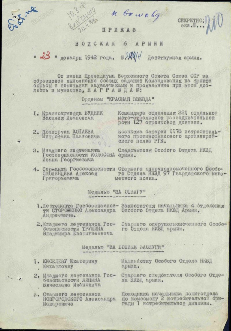Приказом от 23 декабря 1942 года № 0120/Н по шестой Армии Юго-Западного фронта, мой дедушка, заместитель начальника четвертого отделения Особого отдела НКВД лейтенант госбезопасности Стороженко Александр Андреевич, был награжден медалью за отвагу. Ее он получил за мужество, проявленное в бою с фашистами. Они открыли ураганный огонь из пулеметов по нашим солдатам, многие погибли. Мой дедушка первым поднялся и повел солдат за собой в атаку. Фашисты не выдержали, побежали и были разбиты.