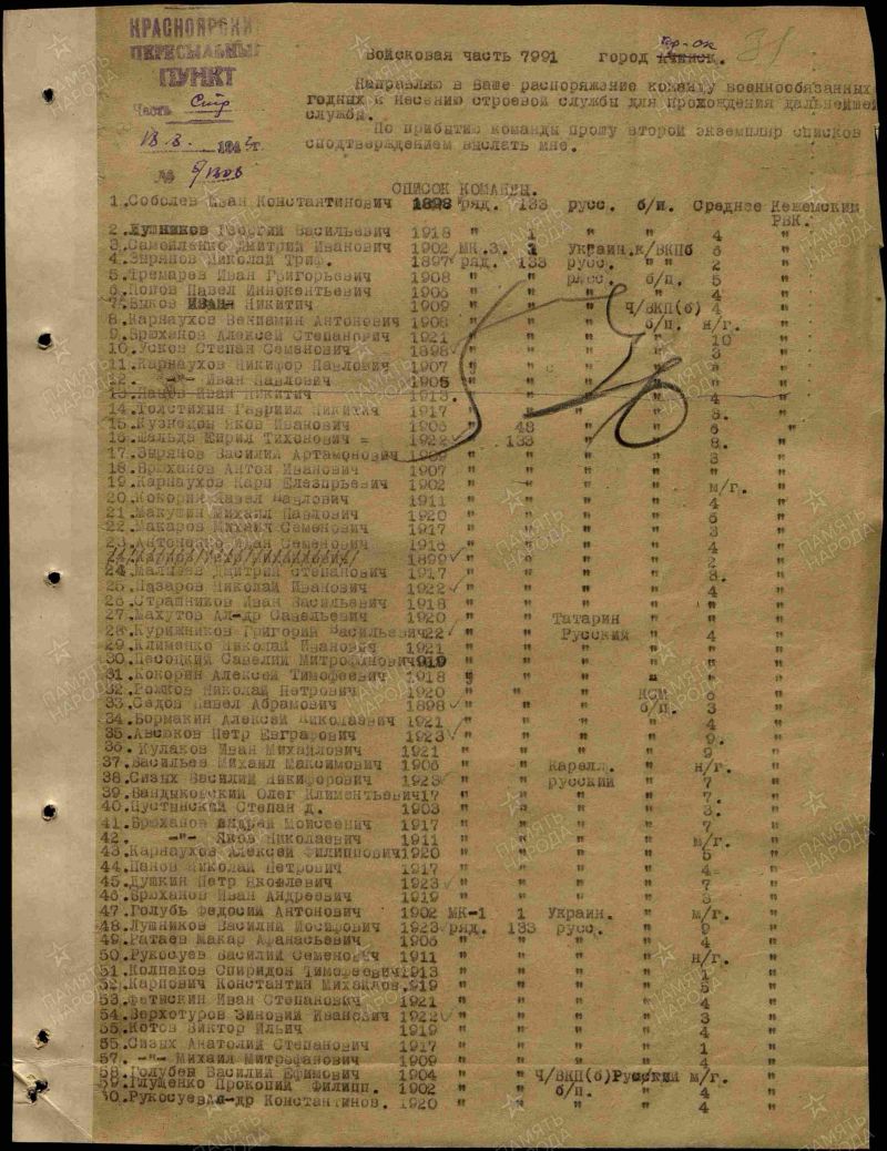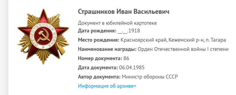 Страшников Иван Васильевич, 1918г.р Место рождения Красноярский край, Кежемский район, д.Чадобец. Призван Кежемским РВК в 1942году .Красноармеец. Стрелок. Участник Сталинградской битвы, битвы на Курской дуге, штурма Берлина. Награжден юбилейным орденом Отечественной войны 1 степени. После войны жил в Красноярском крае, Кежемский район, д.Тагара.