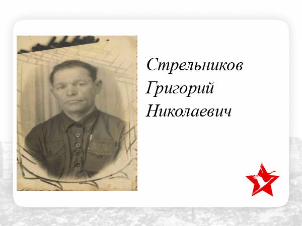 Мой отец Стрельников Григорий Николаевич 1911 года. Родился в селе Мордово Мордовского района Тамбовской области. Всю войну воевал на передовой станковым пулеметчиком. На него пришла с фронта похоронка, но это к счастью была ошибка и он живой вернулся домой. Его плащ-палатка была полностью прошита пулями, но ни одна пуля не попала в него серьезно. У него были награды- медали и орден Отечественной войны 2-ой степени. Он был жизнерадостный человек. Верил в великое будущее нашей страны. После войны работал комбайнером в колхозе "Коммунар". В страду с раннего утра до поздней ночи убирал на своей машине зерно. Хлеб нужен был стране в большом количестве и папа работал с озартом честностью. В семье у него было семеро детей и десять внуков. Всем нам он вместе с мамой прививали любовь к Родине и друг к другу. В нашей большой семье был девиз: "Живи честно и благородно", и этот девиз мы все дети несем по жизни до сих пор. Умер в 1993 году. Мы всегда помним о нем.