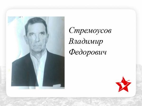 Стремоусов Владимир Федорович родился 21.09.1925г. в Кировской области, Немского района, дер. Лапуги. Был призван в ряды Советской армии в январе 1943г. Тогда ему было всего 17 лет. Служил в 1579 батальоне ПВО (противовоздушная оборона) механиком-водителем с января 1943 по июнь 1944гг. С июня 1944г. по июль 1944г. проходил курсы в учебном автомобильном батальоне на бронеавтомобиле 64. С июля 1944г по март 1946г. служил шофером в роте управления 12 ГТА (Гвардейская танковая дивизия). Закончил войну в звании сержант.