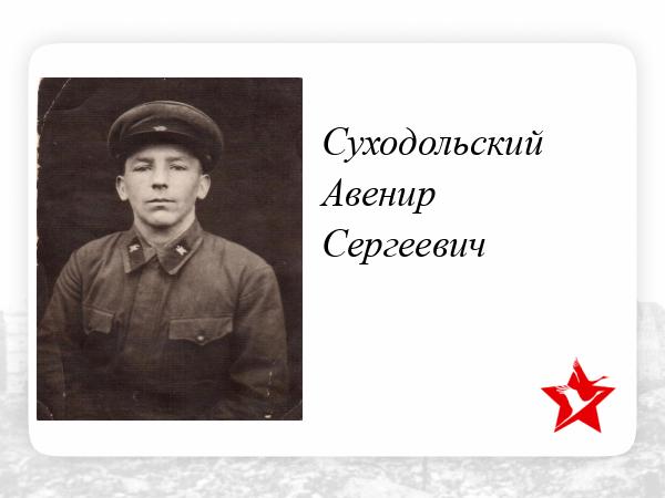 Родной брат моей бабушки (по отцу), Суходольский Авенир Сергеевич, родился в 1917 году, село Введенское на Волге. После срочной службы в армии, работал в Ярославле на станции скорой помощи шофером. С началом Великой отечественной войны был призван на фронт. Со слов родственников, служил водителем, пропал без вести под Смоленском. К сожалению, попытки найти какую-либо информацию о его судьбе результатов не дали.