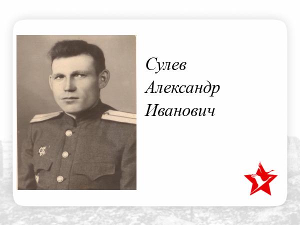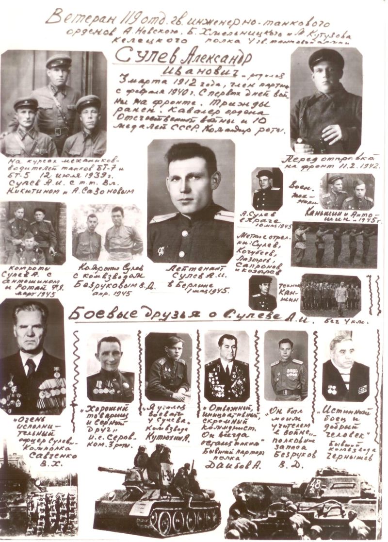 Это дедушка моего мужа, отец моего свекра. Сулев Александр Иванович родился 3 марта 1912 года в х.Широков Иловлинского района Сталинградской области. В 1939 году закончил курсы механиков-водителей танков БТ-7 и БТ-5. Член партии с февраля 1940г. С первых дней войны на фронте. Трижды ранен. Кавалер орденов Отечественной войны и 10 медалей СССР. Закончил войну в мае 1945 года в Праге.