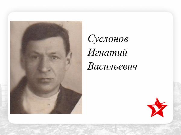 Суслонов Игнатий Васильевич родился 28 декабря 1905 года в деревне Банниково Абатского района Тюменской области. До войны был председателем колхоза имени Чапаева. В 1941 году был призван Абатским военкоматом. Служил в 595 батальоне аэродромного обслуживания в звании рядового по специальности "стрелок". Воинсая часть находилась в Хабаровске, затем в Комсомольске-на-Амуре. В задачи батальона входило обслуживание аэродрома. С этого аэродрома осуществлялись боевые вылеты в Порт-Артур, Мукден и др. Во время войны был контужен, лежал в госпитале. Демобилизовался в 1946 году. Имеет медаль "За Победу над Японией". После войны продолжил работу в колхозе им.Чапаева в должности председателя. Умер 29 апреля 1983 года в с.Викулово Тюменской области.
