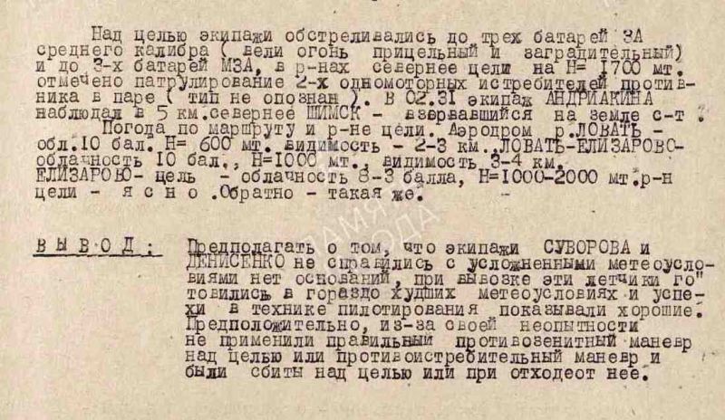 В ночь с 30 марта на 01 апреля 1944г. после бомбардировки железнодорожного узла Петсери (совр. Печоры, Псковская обл.) не возвратился экипаж самолета №10912: летчик младший лейтенант Суворов Дмитрий Михайлович, штурман младший лейтенант Беловол Александр Иванович, воздушный стрелок-радист сержант Главацкий Василий Андреевич, воздушный стрелок красноармеец Ягин Михаил Петрович. Последнюю радиограмму экипаж передал в 03-04. Летчик и штурман производили свой первый боевой вылет.