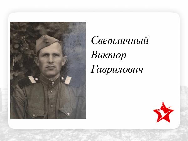 Мой дедушка - Светличный Виктор Гаврилович защищал Родину во время Великой Отечественной войны. В самом начале войны на фронте погибли два его родных брата. Мой прадедушка (дедушкин папа) прошел почти всю войну, был тяжело ранен, но вернулся домой, поправился и в мирное время работал ветеринаром.