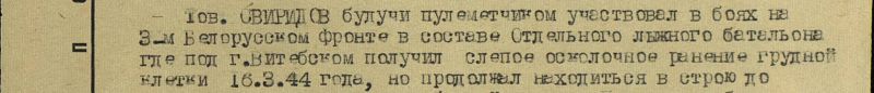 Из наградного листа: «Тов. Свиридов, будучи пулеметчиком участвовал в боях на 3-м Белорусском фронте в составе отдельного лыжного батальона, где под г. Витебском получил слепое осколочное ранение грудной клетки 16.03.1944 года, но продолжал находиться в строю до окончательного выполнения боевой задачи. После чего был эвакуирован в госпиталь на излечение.