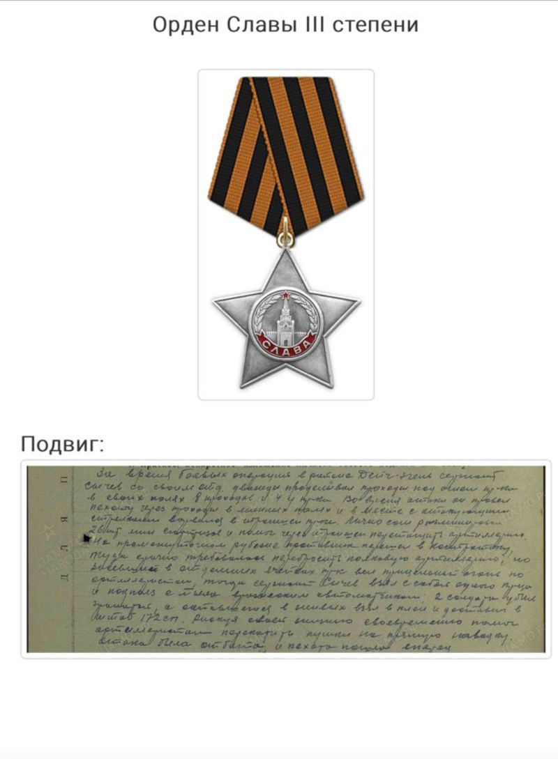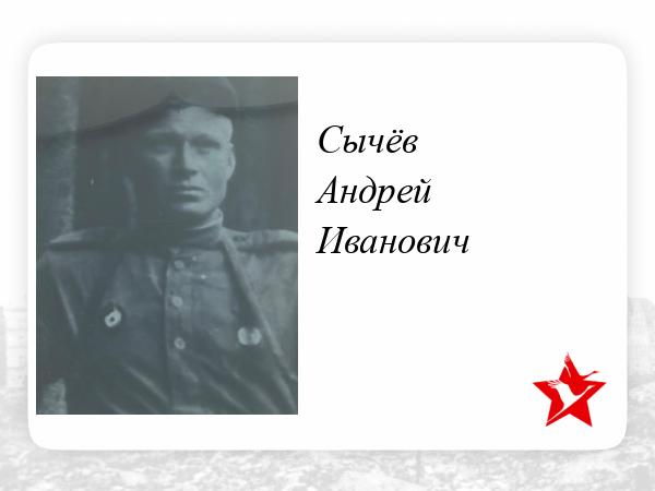В середине войны Андрей Сычев совершил, по моему мнению, самый настоящий подвиг. Водитель грузовика с боеприпасами выполнял «свою работу» и вёз снаряды на передовую. Внезапно появившийся из-за облаков немецкий самолет стал с высоты стрелять по грузовику. Одна из пуль попала в водителя и убила его. Несмотря на такой неожиданный и одновременно трагический момент, мой прапрадед не растерялся, быстро запрыгнул в кабину фургона и продолжил вести автомобиль до места назначения. Андрей вел машину, стараясь уворачиваться от пуль. И хотя сам все-таки тоже получил ранение, он все же довез боеприпасы до своих товарищей-солдат. Прапрадедушка делал это с полным осознанием, что может быть убит, как и его товарищ. Но к огромному счастью этого не произошло.