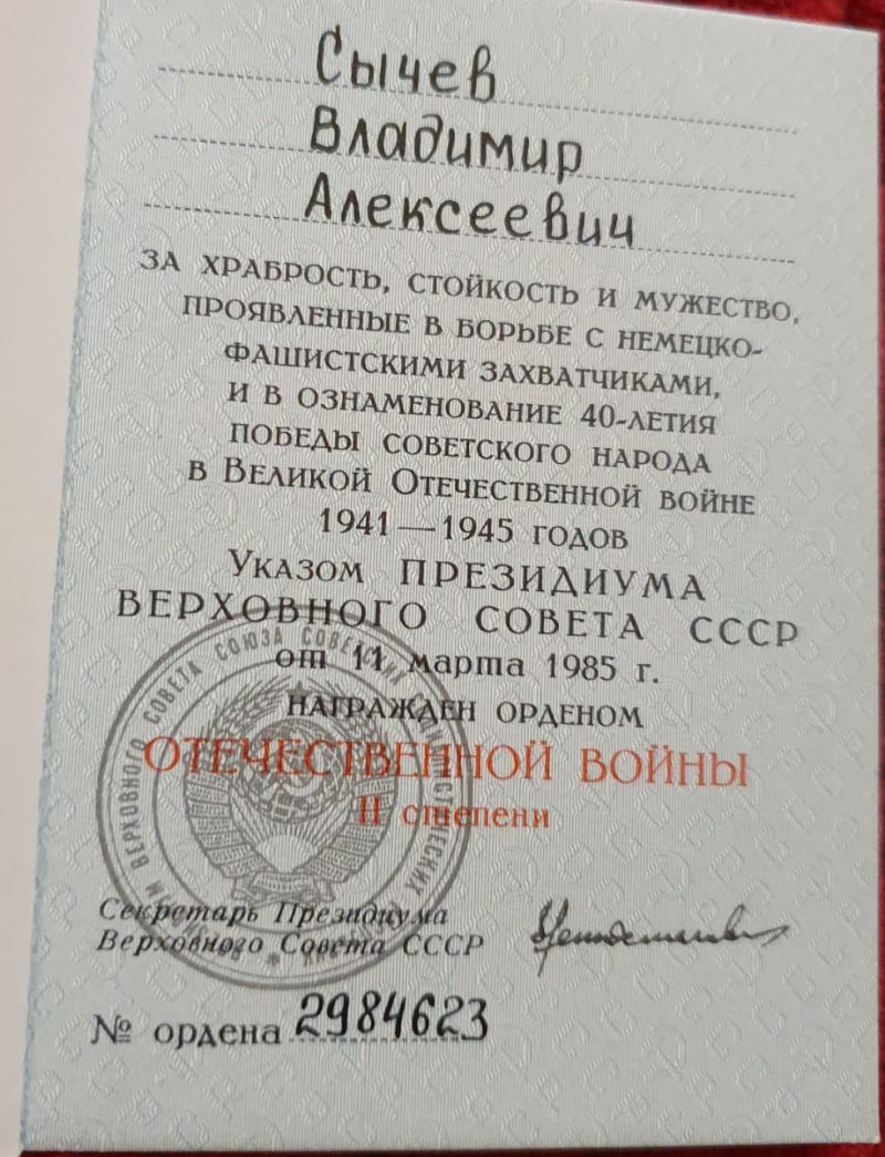 Участник ВОВ в составе 585 БАО Забайкальского фронта. 12.08.1945г. тяжело контужен с нарушением мозгового кровоснабжения с 01.09.1945 по 27.12.1945 находился на излечении в госпитале №UГ-4381, выписан в/часть 23481