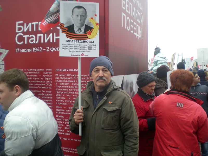 Так получилось, что имя нашего деда на памятных плитах Братской могилы с. Орловка Волгоградской обл выбито четыре раза: с лево на кирпичной стенке 17-ая плита СИРАВЕТГИНОВ Б. С. , 24-ая плита СИРОДИЧИНОВ Б. , далее от угла 16-ая плита СИРАЗЕТДИНОВ Б. С. , СЫРАЗЕТДИНОВ Б.