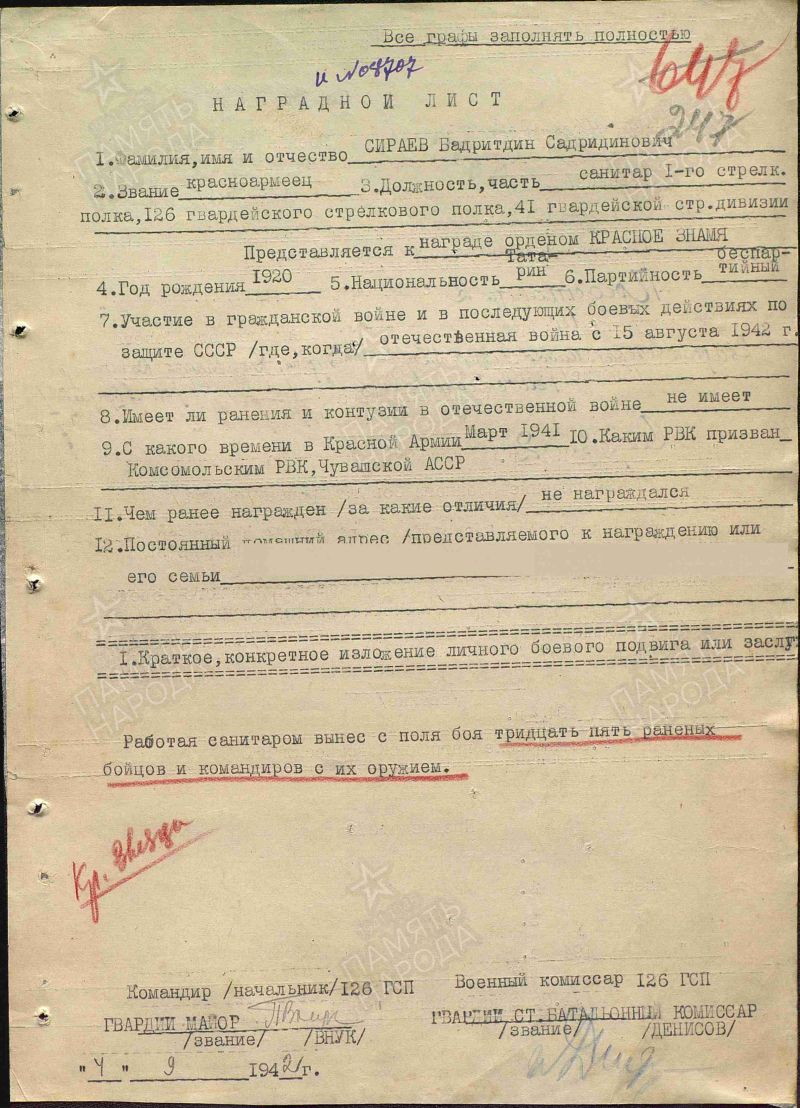 На сайте “ПАМЯТЬ НАРОДА” документы по нему: САРАЗДЫНОВ Садердин Саиронович 1905 гр (6 док)