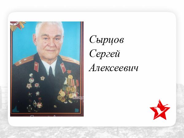 В 1944 г. Сергей Алексеевич Сырцов закончил военное училище в Теплой Горе Свердловской области, и был направлен на фронт, был ранен, контужен. Война для него закончилась в Кенигсберге. Это родной брат моей мамы, о войне он рассказывать не любил, в силу своей скромности, поэтому мы о его боевом пути можем судить только по государственным наградам. После войны дядя не переставал служить до последнего дня в военкомате сначала Батайска, затем Ростова на Дону. Возглавлял Совет ветеранов в г. Ростов. Так до последнего дня и работал.... Помер, в троллейбусе, следуя на работу от оторвавшегося тромба, в 93 года.... Это настоящая гордость нашей семьи!