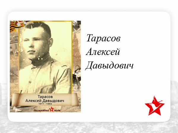 Мой дед,Тарасов Алексей Давыдович с самого начала Великой Отечественной Войны пошел на фронт.За участие в героической обороне Москвы награжден медалью "ЗА ОБОРОНУ МОСКВЫ".Награжден Орденом Отечественной войны II степени.Мой дед был смелым,отважным воином.Память о нем будет вечно в моем сердце.