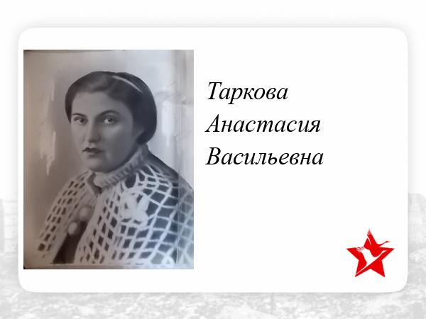 Моя про бабушка, Таркова Анастасия Васильевна, стала членом ВЛКСМ в 1935 году, а в первые год войны была принята в ряды Коммунистической партии. Работала она на Томском лесоперевалочном комбинате бухгалтером. Была секретарём комсомольской организации.