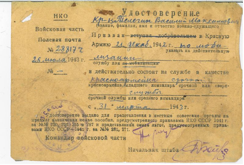 Призван 21 декабря 1942 года. Погиб от ран 6 января 1944 года на Украине под гором Фастов Киевской области.