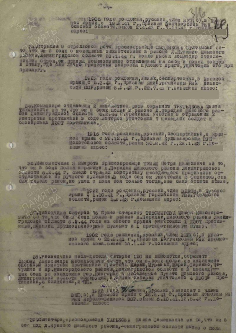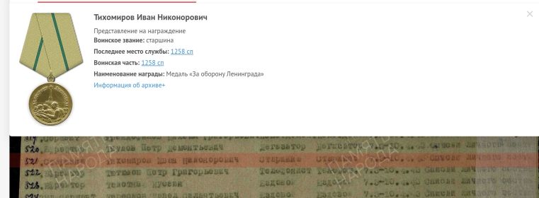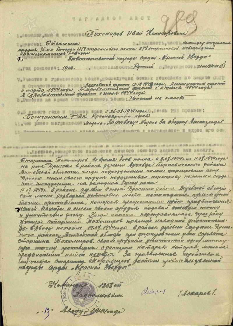 Тихомиров Иван Никонорович, 1902 г. р. Место рождения Горьковская область, Ивановский район, д. Пустащна. До войны жил в Красноярском крае, Богучанский район, с. Богучаны. Призван Богучанским РВК в 1941 году. Член ВКП б. Старшина. Командир отделения. В/ч 1258 сп 378 сд. Ранен 18.01.1942 года. Награждён медалью За оборону Ленинграда, медалью За отвагу, орденом Красной Звезды, медалью За Победу над Германией в Великой Отечественной войне 1941-1945 гг.