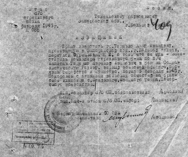 Спустя 70 лет мне удалось найти копию похоронки, где сказано, что «заместитель командира стрелкового батальона по п/ч капитан Тищенко Евгений Иванович в бою за Социалистическую Родину, верный воинской присяге, проявив геройство и мужество, погиб 5 февраля 1945 года. Похоронен с отданием воинских почестей на братском кладбище с. Штайнваге, Швецкого уезда, Поморского воеводства»... (Территория современной Польши. Позже я нашла информацию об этой братской могиле. Оказывается, там установлен памятник, но на нём указаны всего несколько фамилий из около двухсот захороненных там солдат. Пыталась внести информацию о прадедушке для размещения на памятнике через Красный крест, но ответа так и не получила. Очень надеюсь в будущем посетить это место вместе со своим сыном.)