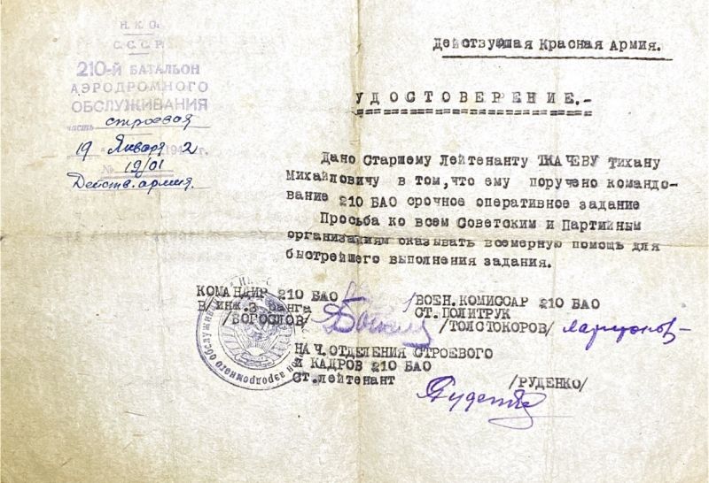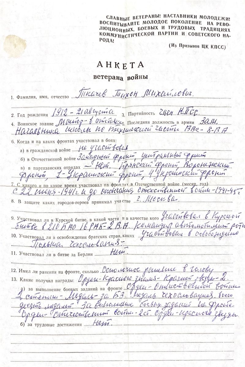 На протяжении всей Великой Отечественной войны Тихон Михайлович был в должности командира автомобильной роты и далее в должности командира отдельного автотранспортного батальона. Обслуживал боевые авиационные полки по обеспечению всем необходимым для жизни и боя: подвозка боеприпасов, горюче-смазочных материалов, авто-техимущества, продовольствия и, непосредственно на аэродромах, осуществлял тех-обеспечение авто-полков, заправку самолетов.