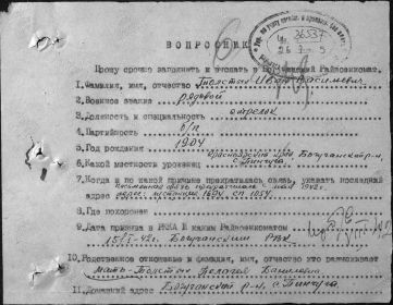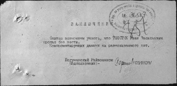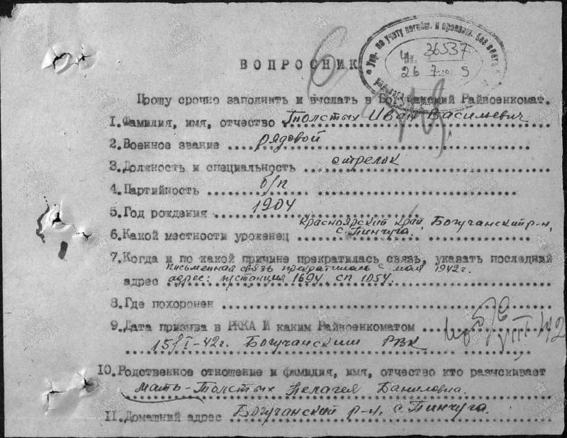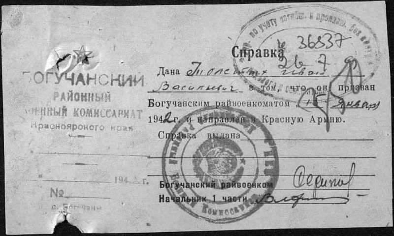 Толстых Иван Васильевич, 1904 г. р. Место рождения Красноярский край, Богучанский район, д. Пинчуга. Призван в январе 1942 года. Красноармеец. Стрелок. В/ч 1054 сп 301 сд. Последне письмо родные получили в мае 1942 года. Пропал без вести в августе 1942 года. Дивизия вела бои в Курской области. Мать Толстых Пелагея Даниловна.