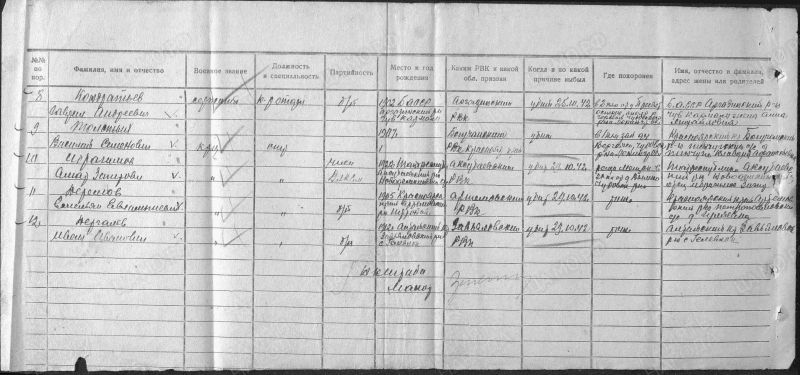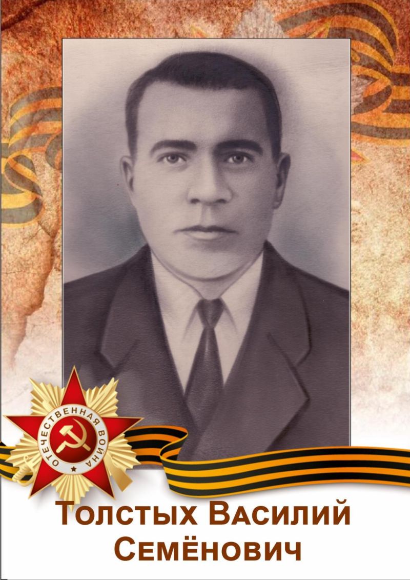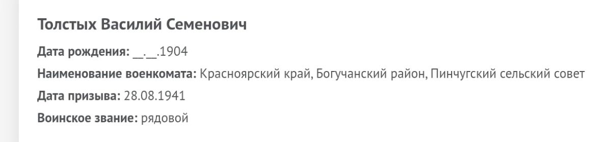 Толстых Василий Семёнович, 1904 г. р. Место рождения Красноярский край, Богучанский район, д. Пинчуга. Призван Богучанским РВК в 1941 году. Красноармеец. Стрелок. В/ч 1251 сп 377 сд. Убит в бою 25.10.1942 года. Он же внесен в списки безвозвратных потерь по в/ч 1269 сп 382 сд. Похоронен Ленинградская область, Чудовский район, д. Вергежа, западнее 1 км. Жена Толстых Клавдия Афанасьевна.