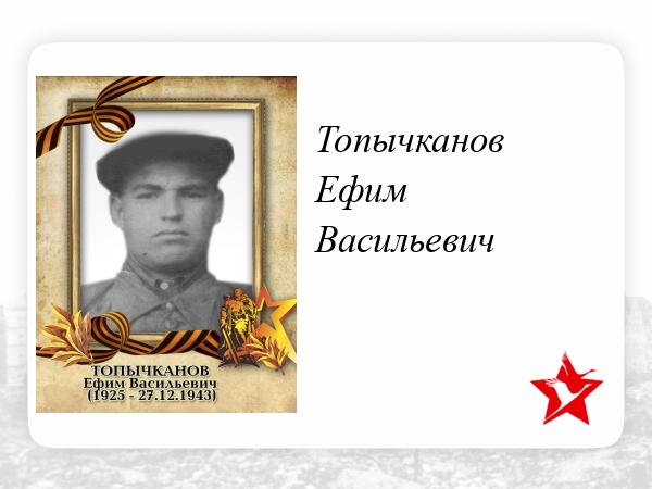 Топычканов Ефим Васильевич родился в 1925 году в поселке Атарша Новобелокатайского района Башкирской АССР. В раннем возрасте потерял родных и проживал у тети. Работал слесарем на кусинском машиностроительном заводе. Окончил ФЗУ. Кусинским РВК был призван на фронт. Служил в составе 130 стрелкового полка при штабе 44 гвардейской стрелковой дивизии. Должность - стрелок.
