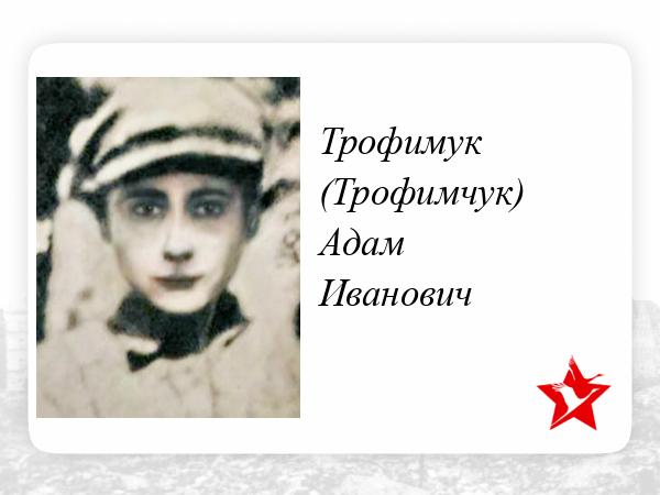 В мае 2014г. я нашла о нем данные в ОБД «Мемориал (фамилия написана как Трофимук) и Электронном банке документов «Подвиг народа в Великой Отечественной войне 1941-1945гг.» (фамилия написана как Трофимчук). Правильно – Трофимук Адам Иванович, но указываю оба варианта в надежде, что кто-то из однополчан и/или их родственников узнает по этим фамилиям нашего солдата и отзовется.