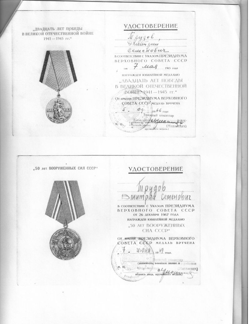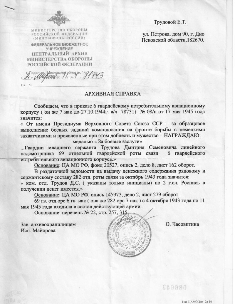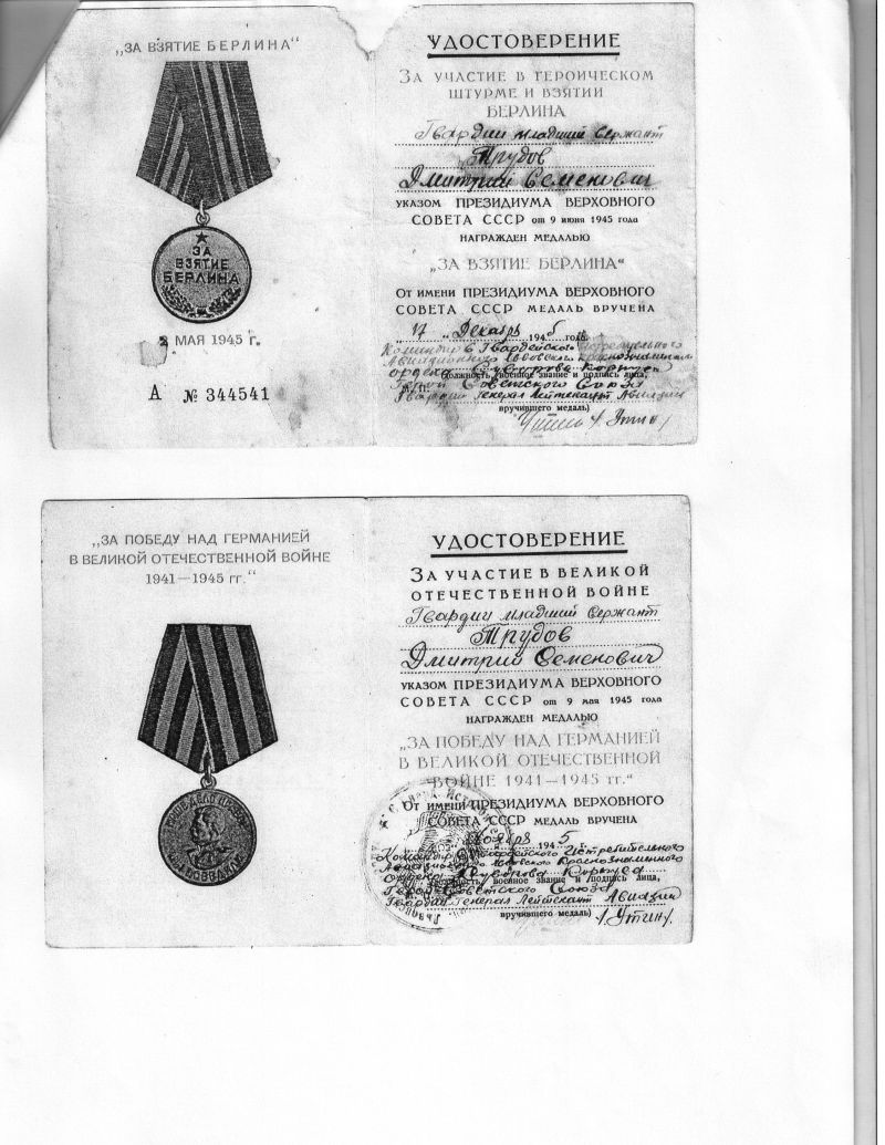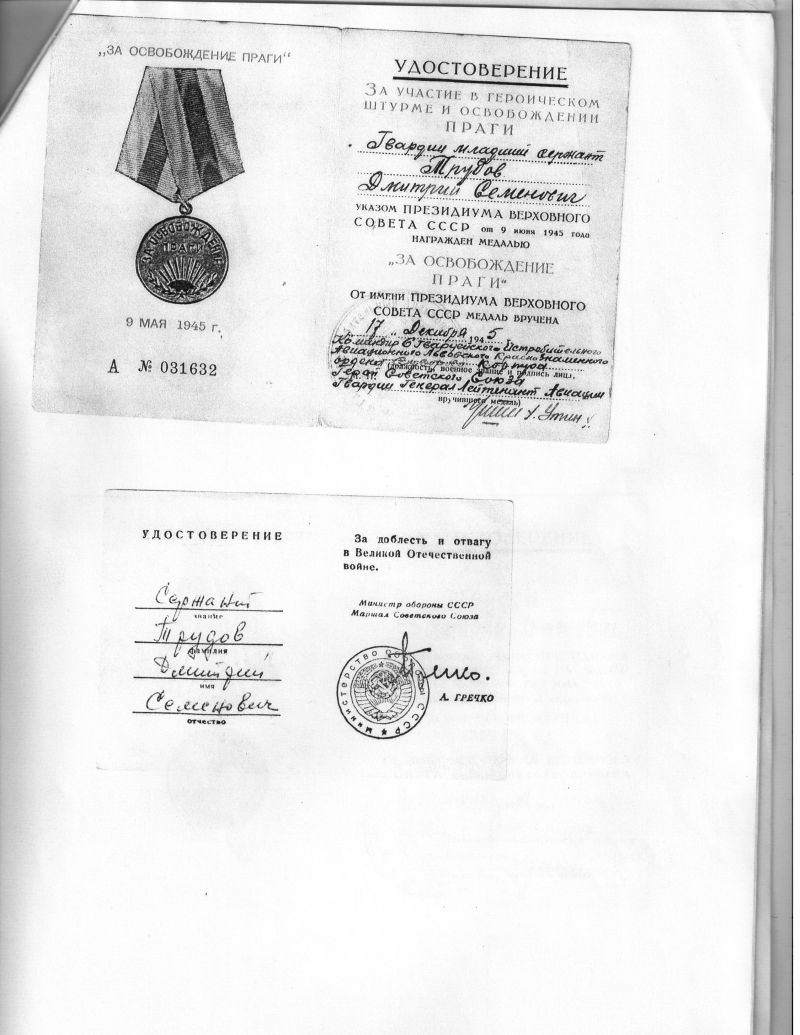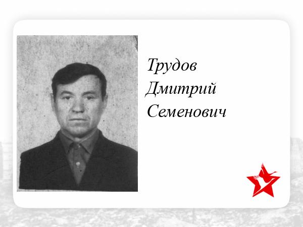 Я хочу рассказать о своем дедушке Трудове Дмитрии Семеновиче. Дедушка ушел на войну из г.Пензы в 18 лет в 1941 году. Служил рядовым, а потом и гвардии младшим сержантом линейным надсмоторщиком 69 отдельной гвардейской роты связи 6 гвардейского истребительного авиационного корпуса, который с 4 октября 1943 года по 11 мая 1945 года входил в состав действующей армии. Я очень горжусь им, ведь он участвовал в героическом штурме и взятии Берлина, в героическом штурме и освобождении Праги.Он прошел всю войну и видел ее окончание. Он на себе ощутил весь ужас и лишения войны. Но он выжил, чтобы дать жизнь нам-его потомкам. И я , его внучка, с гордостью рассказываю своим детям о том, что у меня был такой дедушка. Сейчас его уже нету в живых. Он похоронен в г.Дно Псковской области, где прожил все послевоенные годы. Вечная слава и вечная память Трудову Дмитрию Семеновичу.