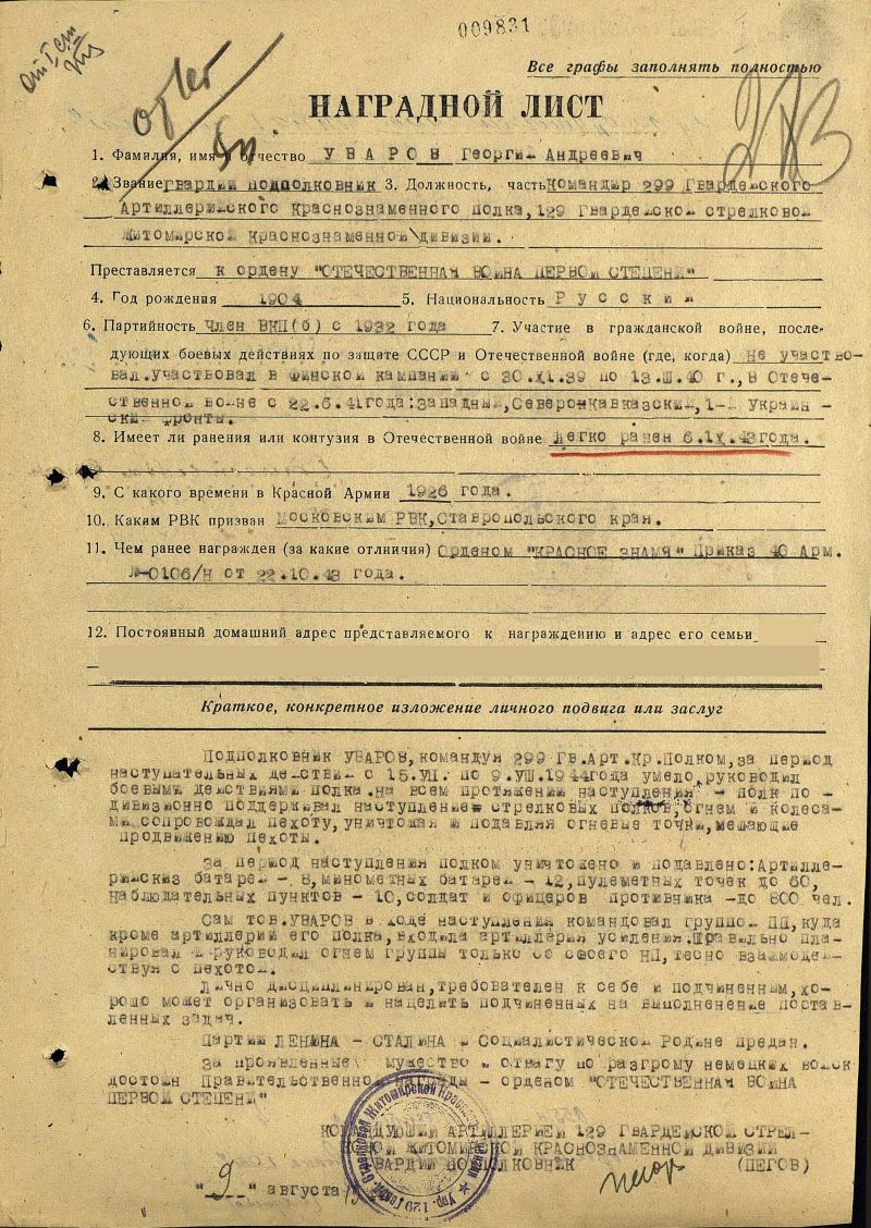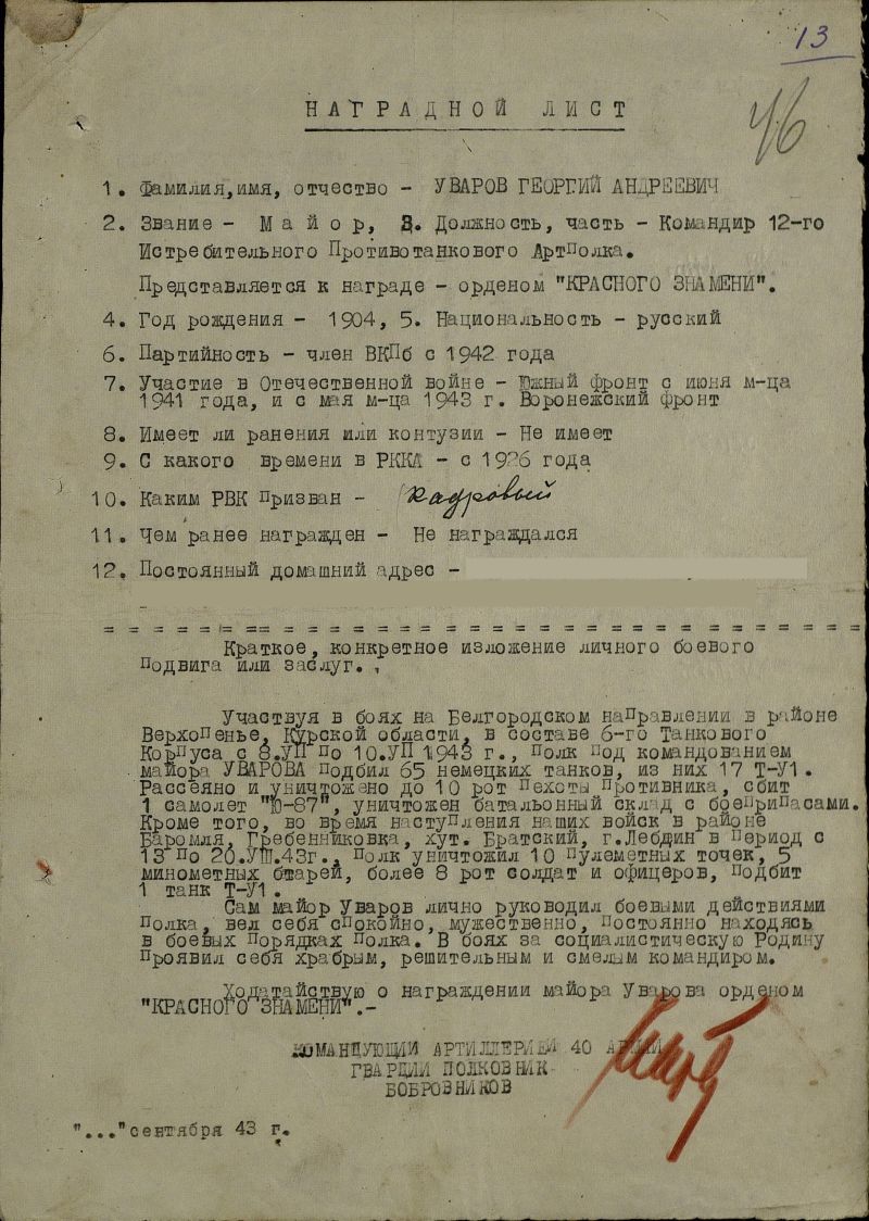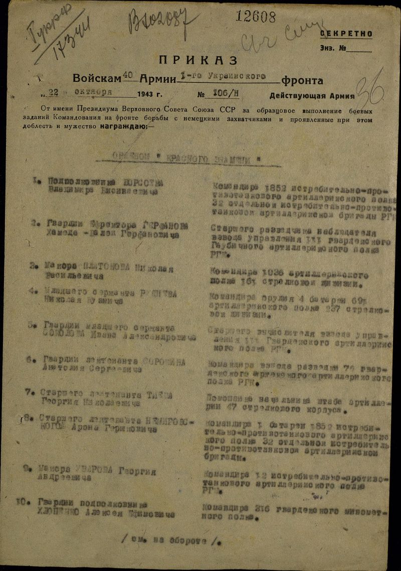 Конец Великой Отечественной войны встретил в звании полковника. Участвовал в боях на Курской дуге. Награждён Орденами Красного знамени трижды, Орденом Отечественной Войны 1 степени дважды, Орденом Красной звезды.