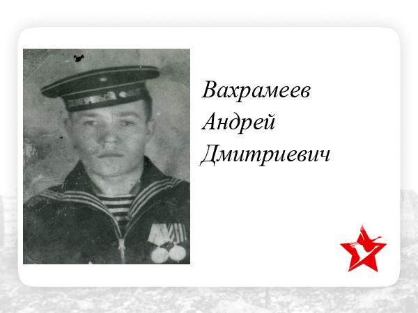 Вахрамеев Андрей Дмитриевич родился 15.10.1924 года в деревне Подбережье Череповецкого района, окончил 4 класса школы, учился в ремесленном училище. В 1942 году был призван в ряды Красной Армии на Северный Фронт, где и прошел всю войну.