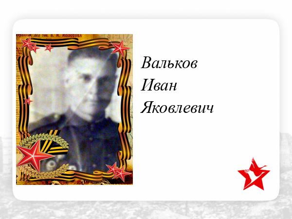Вальков Иван Яковлевич, 1916 года рождения, уроженец села Илюшкино Павловского района, Ульяновской области (Куйбышеская область), призван в Красную Армию в1937 году, участник Финской кампании, был тяжело ранен, контужен, обморожен, долго лечился по госпиталям. Архивы, вероятно, утеряны. По его воспоминаниям, после лечения был переброшен под Сталинград. При освобождении которого горел в танке, был признан мертвым и помещен в морг, где позже пришел в сознание. Родственники подтверждали, что из госпиталя получили письмо, в котором просили обеспечить уход за ним, но они приехать не смогли. После лечения в госпитале, он вернулся на фронт. Согласно наградному листу, в Великую Отечественную войну воевал на Калининском фронте в период с 29.07.1942 по 02.1943г., на 1-м Прибалтийском в период с 02.1943г. по 20.12.1943г.,на 1-м Украинском фронте с 15.07.1944г. по 03.02.1945г.
