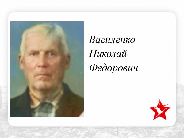 Василенко Николай Федорович родился в 1908 г. в селе Мальцы Миргородского района Полтавской области. 3 класса образования, колхозник, портной. Призван по мобилизации Миргородским РВК в сентябре 1943 г. красноармейцем в 86 кавалерийский полк 32 СД. После ранения в ногу находился на излечении с марта по октябрь 1945 г. в эвакогоспитале N1386. Дата совершения подвига: 26.06.1944,08.07.1944.