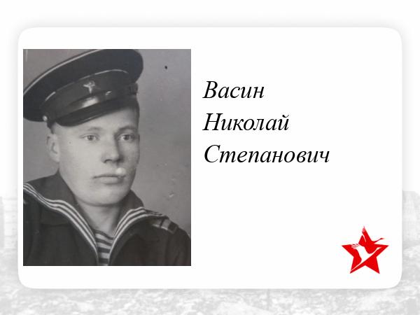 Васин Николай Степанович родился 12 мая 1924 года в поселке Жамантуз Щучинского района, Казахская АССР. В 1943 он ушел на фронт. Служил на Балтийском флоте старшим матросом до конца войны. После войны был ранен в Эстонии и был комиссован. Награжден Орденом Великой Отечественной Войны 2-ой степени, медалями за храбрость, стойкость и мужество. Умер 25 января 1981