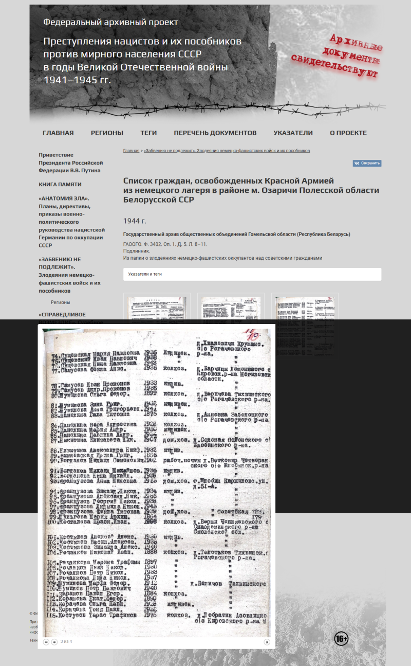 В начале 1944 года линия фронта проходила на территории Беларуси вдоль рек Днепр и Березина. Красная армия продолжала успешное наступление. Фашисты придерживались тактики выжженной земли, уничтожали всю инфраструктуру, а гражданское население гнали в прифронтовую зону. 10 марта 1944 года был создан концлагерь “Озаричи”, в который в короткий срок согнали: стариков, нетрудоспособных женщин, детей. Сам концлагерь «Озаричи» состоял из трёх оборудованных концлагерей, построенных на редколесье и заболоченной территории. «Озаричи» был единственным лагерем, где мирное население содержалось в болоте в холодное время года, без крова, тепла и пищи, а узников преднамеренно заражали тифом. Они питались тем, что сумели спрятать, а также — мхом, найденными на болоте ягодами клюквы. Узникам запрещалось разводить костры не только ночью, но и днем. Правда, иногда замешенный на опилках хлеб доставляли немцы. За 9 дней в "Озаричи" было согнано более 50 тысяч мирных жителей. В живых осталось 34 тысячи. Из них: 16 тысяч детей, 13 тысяч женщин, около 5 тысяч стариков. Погибло около 15 тысяч (подтвержденные данные, по неподтвержденным больше 17 тысяч). Более 7 тысяч были заражены тифом, часть из них в ближайшее время после освобождения умерли. Многие погибли при освобождении, т.к. фашисты заминировали подходы к лагерю и разбросали при отступлении еду и одежду на минном поле. Голодные и холодные люди сами бежали на мины. Бежали к советским солдатам. В течение двух дней 18-19 марта 1944 года войска 18-го корпуса Самарской 65-й армии 1-го Белорусского фронта освободили из Озаричских лагерей 34 110 человек, из них — 15 960 детей в возрасте до 13 лет, в том числе — 517 сирот, 13 072 женщины и 4448 стариков. Среди спасённых были и грудные дети. Более трехсот человек из числа освобождённых узников имели пулевые и осколочные ранения.