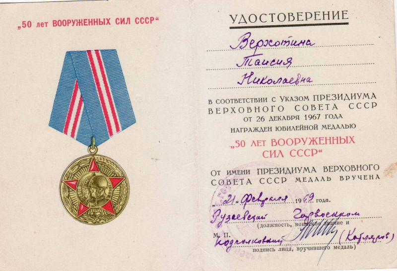 - медали «50 лет Вооружённых Сил СССР»: удостоена в 1969 году;