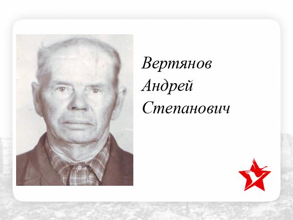 Моего прадедушку, Вертянова Андрея Степановича, забрали на войну в августе 1941 года. Ему тогда было 34 года. Он вместе со всеми мужчинами из села Сакаево ушел на фронт. Он воевал в 1113 стрелковом полку рядовым солдатом.25 марта 1942 года, когда они защищали город Тамбов, он был контужен и ранен в правую лопатку. Его отправили в госпиталь в город Тамбов, где он пролежал до 13 марта 1942 года.
