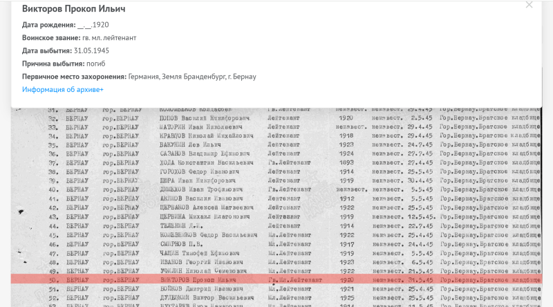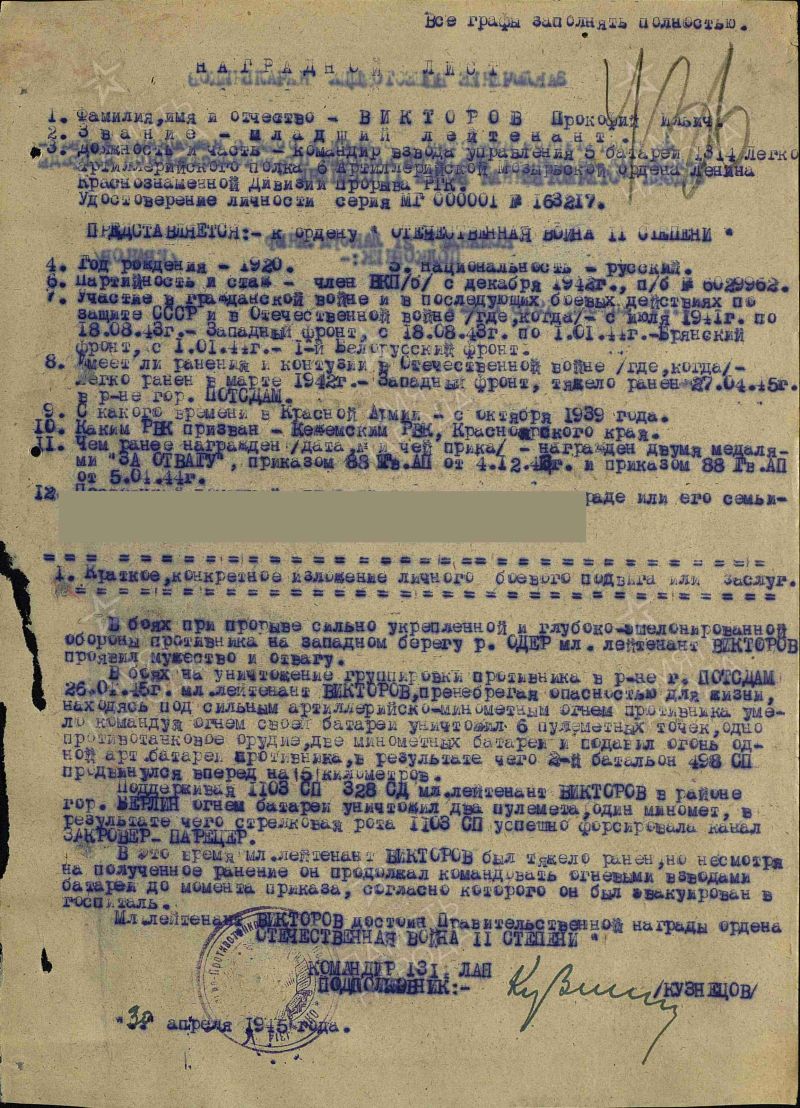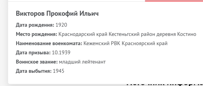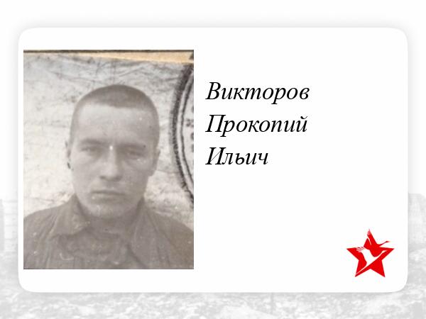Викторов Прокопий Ильич,1920г.р. Место рождения Красноярский край, Кежемский район, д.Костино. Призван Кежемским РВК в октябре 1939 года с 1 курса педагогического училища.Гв.мл.лейтенант. Командир взвода. В/ч 88 гв.ап 38 гв.ад.,1314 лап 6 ад.Ранен в 1942 году,ЭГ 3454.Член ВКП (б) с декабря 1942 года.Награжден медалью За отвагу, медалью За отвагу, орденом Отечественной войны 2 степени (приказ подписан 30.05.1945 г.)Ранен в ногу 27.04.1945 года,440 МСБ. Умер от ран 31.05.1945 года в ХППГ 338.Похоронен Германия. Земля Бранденбург, г.Бернау.мать Викторова Степанида.