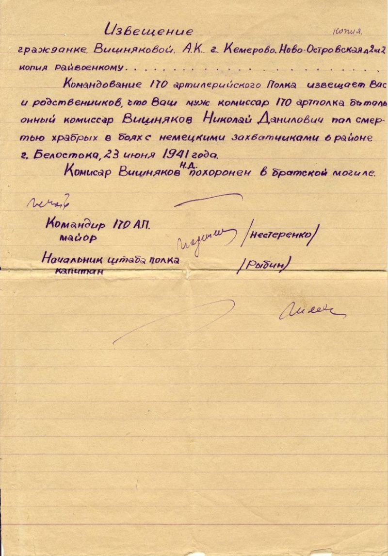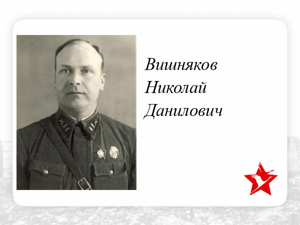 Батальонный комиссар ВИШНЯКОВ НИКОЛАЙ ДАНИЛОВИЧ, 1904года рождения, место рождения - РОССИЙСКАЯ ИМПЕРИЯ, Московская губерния, губернский город Москва (предположительно; по административному делению: 1. СССР: РСФСР, Московская область, город Москва; 2. РОССИИ:город Москва, столица, город федерального значения), русский. Год призыва в РККА: неизвестен. Образование: 1. Гражданское (общее): Школа (в ?г.); 2 Военное: ? Участник войн: 1. Советско-финлядской в должности: Заместителя по политической части командира 170 лёгкого полка, 37 мотострелковой Новочеркасской Краснознамённой дивизии имени А. И. Егорова, 56 стрелкового корпуса; боевые действия в районе города Питкяранта (Pitkäranta), Выборгской губернии (Viipurin lääni), Финляндской Республики (Suomen tasavalta); в н. вр.: РОССИЯ: Республика Карелия, Питкярантский муниципальный район, Питкярантское городское поселение, город Питкяранта); 3. Великой Отечественной, с 22.06.1941 года, в должности: Заместителя по политической части командира 170 лёгкого артиллерийского полка, 37 стрелковой Новочеркасской Краснознамённой дивизии имени А. И. Егорова, 21 стрелкового корпуса, Западного фронта. Награды: 1. Орден “КРАСНОЙ ЗВЕЗДЫ” (20.05.1940); 2. Медаль “20 ЛЕТ РККА” (02.1938). С Великой Отечественной войны не вернулся: 23.06.1941 года, убит в бою: Белорусская ССР, Белостокская область, Гродненский район, Лидский повет, в районе деревни Тавсюны (35 км. от города Лида; в н. вр.: ЛИТОВСКАЯ РЕСПУБЛИКА (Lietuvos Respublika): Вильнюсский уезд (Vilniaus apskritis), самоуправление Шальчининкайского района (Šalčininkų rajono savivaldybė), Эйшишкесское староство (Eišiškių seniūnija) деревня Таусюнай (Tausiūnų). Захоронен (первичные захоронения, советских воинов, погибших в 1941 году, перезахоронены; предположительно): ЛИТОВСКАЯ РЕСПУБЛИКА (Lietuvos Respublika): Вильнюсский уезд (Vilniaus apskritis), самоуправление Шальчининкайского района (Šalčininkų rajono savivaldybė), Эйшишкесское староство (Eišiškių seniūnija), город Эйшишкес (Eišiškių miestas), ул. Родунес (Rodunes gatvė), 51, кладбище советских воинов (Sovietų karių kapinės). Родственники: РСФСР, Новосибирская область, Кемеровский район, город Кемерово, ул. Ново-Островская, дом 2, кв. №2, жена Вишнякова А. К.