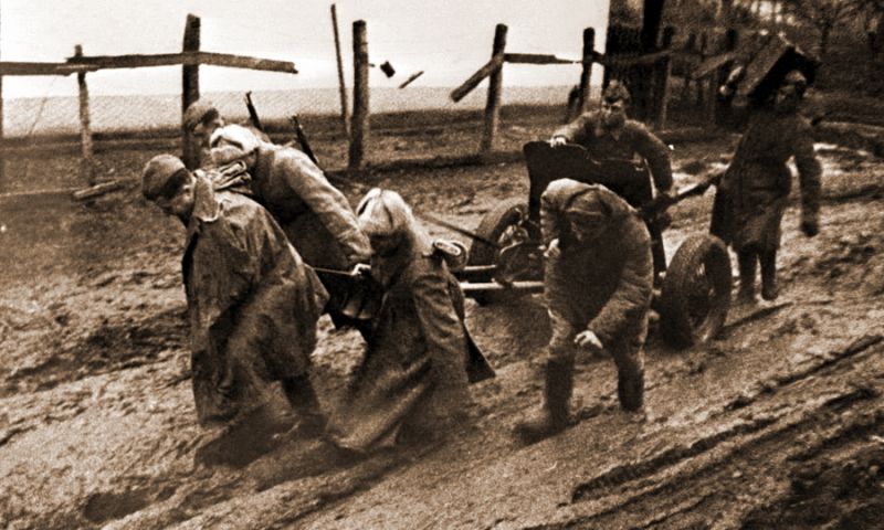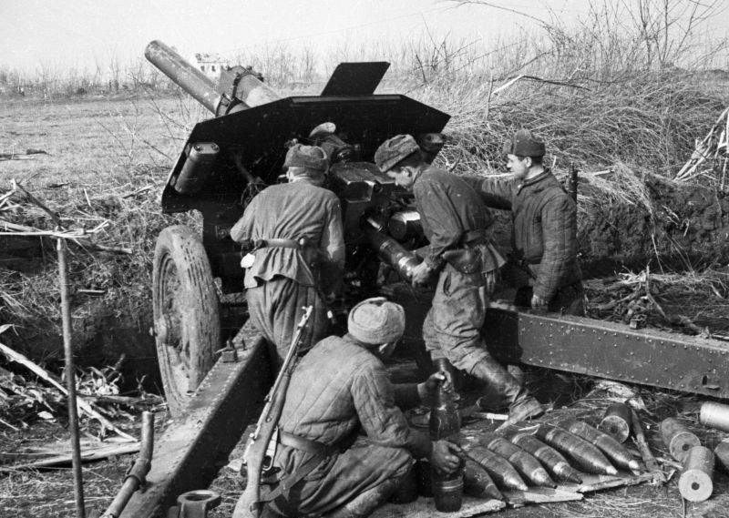 “Зима-весна 1945г. Расчёт 45-мм противотанковой пушки (53-К) образца 1942 года меняет огневую позицию, в ходе боёв в Венгрии. В случае необходимости артиллеристам приходилось самим выступать в роли тягловой силы.”;