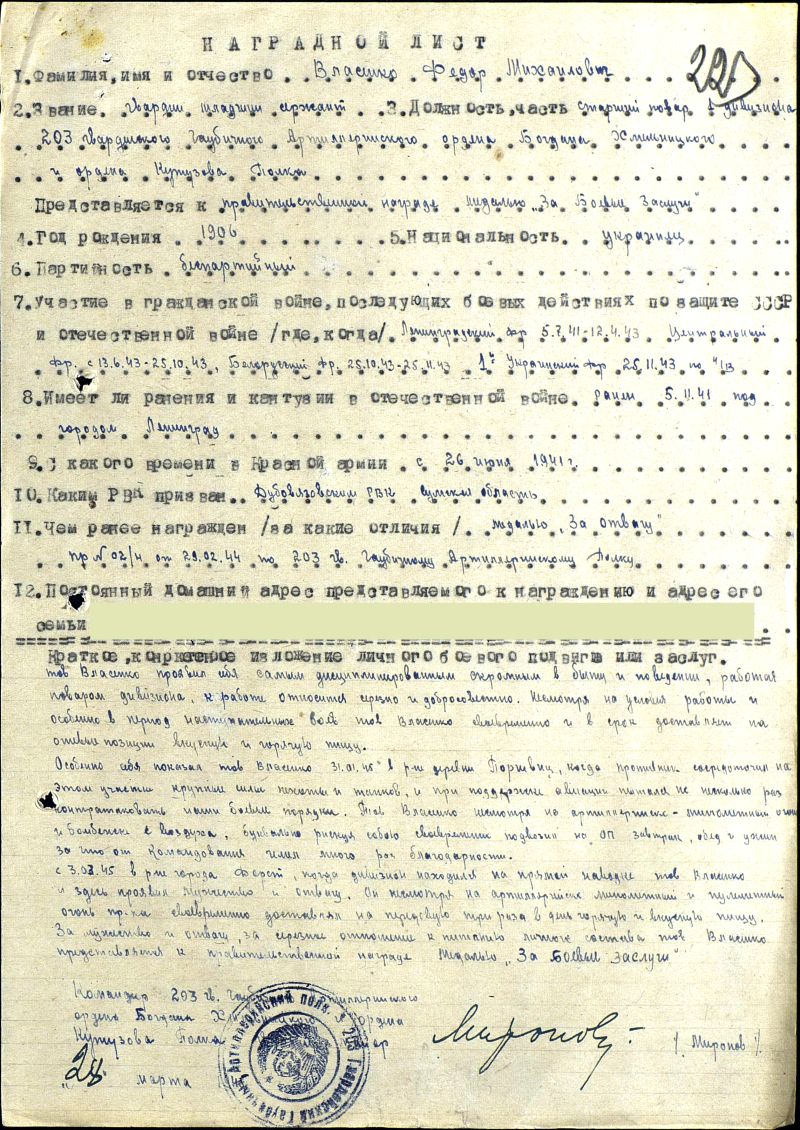 Старший повар 1 дивизиона 203 гвардейского гаубичного артиллерийского ордена Богдана Хмельницкого и ордена Кутузова полка. Прошел всю войну с лета 1941 по май 1945. Ленинградский фронт 05.07.1941 - 12.04.1943, Центральный фронт 13.06.1943 - 25.10.1943, Белорусский фронт 25.10.1943 - 25.04.1943, 1-ый Украинский фронт 25.11.1943 до окончания войны