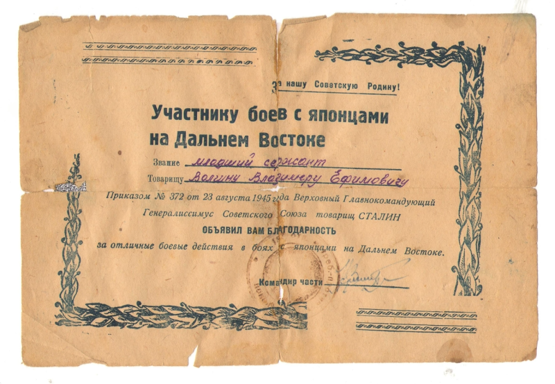 С февраля 1945 года был комсоргом 187 дивизиона в звании младший сержант. За умелое руководство комсомольской организации во время боев с Японскими империалистами, награжден двумя медалями “За боевые заслуги” а в 1946 году в звании сержанта был награжден “За победу над Японией”.