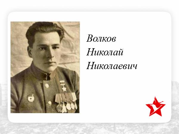 В январе 1945 года отличился сержант Волков на Сандомирском плацдарме в западной Польше, уничтожив большое количество живой силы и боевой техники врага. За смелый подвиг Волкову Николаю Николаевичу вручены орден Ленина и Золотая Звезда Героя Советского Союза.