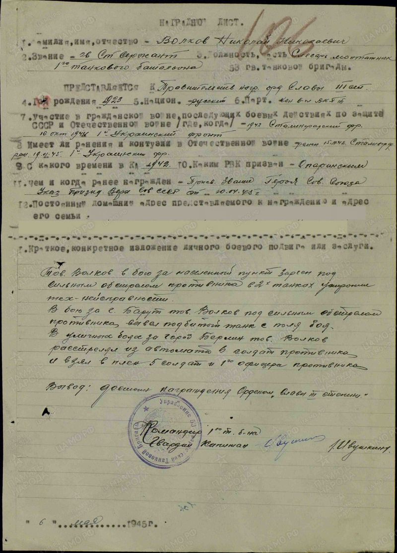 10 апреля 1945 года Николаю Волкову было присвоено звание Героя Советского Союза, а уже 16 апреля Герой Советского Союза гвардеец Николай Волков участвовал в берлинской наступательной операции, форсировании реки Шпрее. Берлин капитулировал, но не кончилась война для Волкова. 8 мая 1945 года он мчался на своей «тридцатьчетвёрке» на помощь восставшей Праге.
