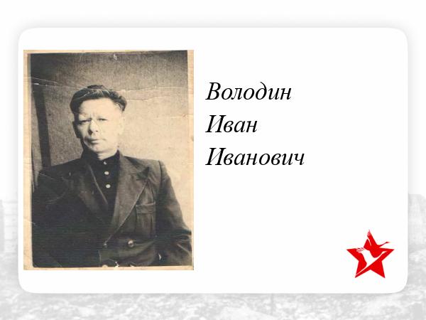 Мой дед, Володин Иван Иванович 1908 года рождения, ушел на фронт 25 июня 1941 года из села Малороссийского. Дома он оставил жену Матрёну и четверых детей: младшей было десять дней. Дед вернулся в феврале 1946-ого года. Эти годы войны дед вспоминал мало. Когда деда не стало в 1977 году, мне было тринадцать лет. Дед запомнился светлым, жизнерадостным, очень общительным человеком. Когда мы его просили рассказать о войне, он как будто темнел и говорил: "Война - это страшная, грязная работа". И рассказывал только о светлых моментах пережитого. А было всякое: окружение под Рогачёвым, плен, побег из плена, лагерь НКВД, снова фронт, освобождение Кавказа и Крыма, Харьковская катастрофа... Победу он встретил в Берлине.