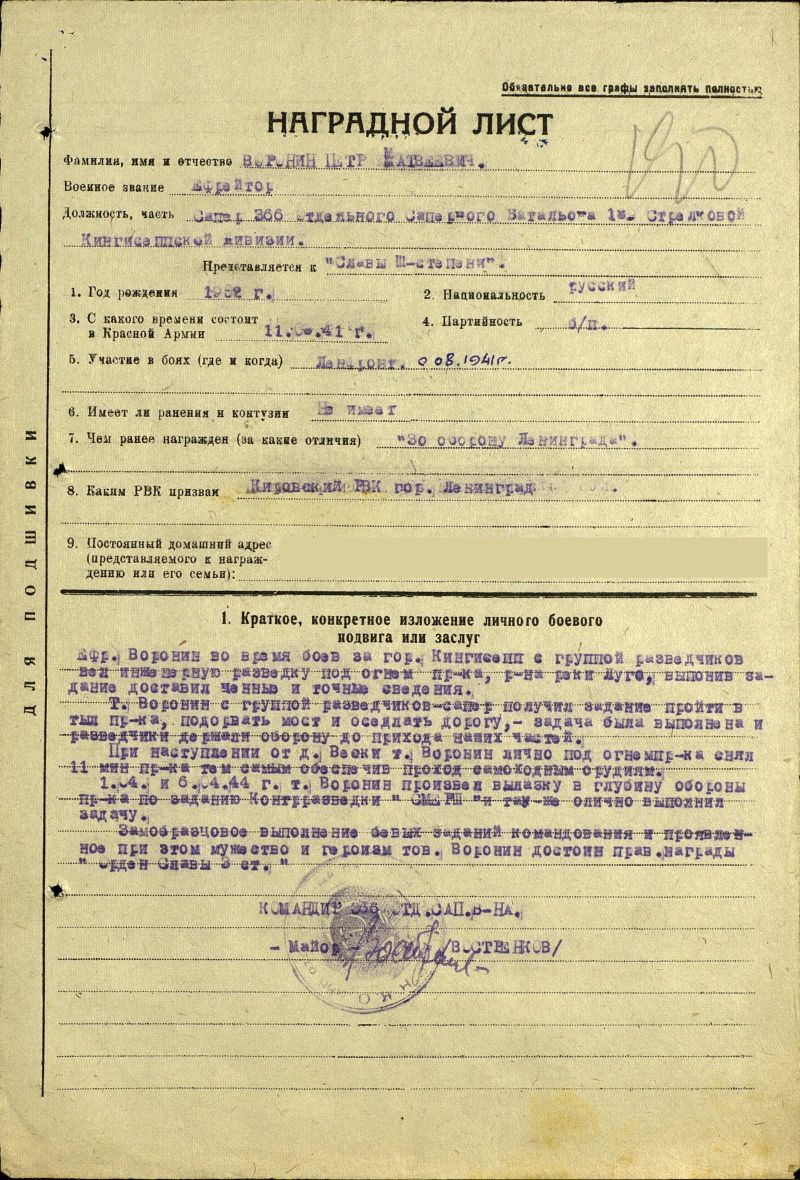 Во время боев за г. Кингисепп вел инженерную разведку под огнем противника.