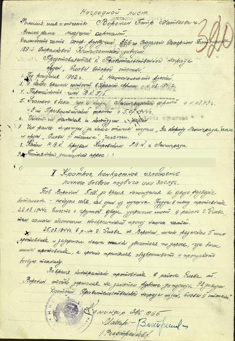 Наш прадедушка. 1902 года рождения. На фронте с августа 1941 года. Был сапером-разведчиком 366-го отдельного саперного батальона 189 стрелковой кингисеппской дивизии. Служил на Ленинградском фронте, затем на Прибалтийском. За время службы награжден двумя орденами Великой Отечественной Войны II-й и III-й степени, а также медалью за оборону Ленинграда.