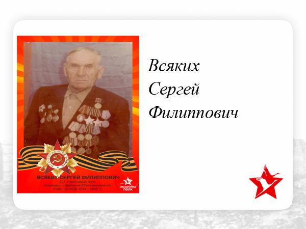 Сергей Филиппович родился в Ростовской области Целинском районе в селе Срелне-Егорлык 17 сентября 1919 года. После насильственного переселения его вместе с родителями-кулаками в начале 30-х годов оказался в Асиновском районе. Работал вальщиком на лесозаготовках в Батуринском леспромхозе. 20 мая 1942 года, когда ему исполнилось 23 года он был призван в армию и попал сразу же в самое пекло войны, на оборону Сталинграда. Там заслужил первую боевую награду-медаль "За отвагу", а чуть позже. в мае 1943 был награжден медалью "За оборону Сталинграда". Очередной военный подвиг Сергея Всяких был отмечен в 44-м, когда была прорвана оборона фашистов близ города Ковель, тогда он был награжден орденом Славы третьей степени. В январе 45-гонагражден был орденом Красной звезды. Участвовал в боях при форсировании Одера, за что былнагражден орденом Славы второй степени. После этого были бои за Варшаву и Берлин. Принмал участие в параде союзных войск в Берлине. В 1946 году, после демобилизации работал в Лайском леспромхозе до самого ухода на пенсию. 7 мая 1971 года за высокие трудовые достижения был удостоен высшей государственной награды - орден Ленина. Умер в 1997 году.