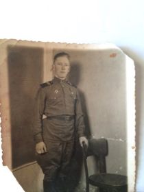12 марта 1945 года, в районе Голясовице, находясь на передовом НП, им было восстановлено 12 порывов телефонной линии, чем способствовал нормальному ведению огня батареи.